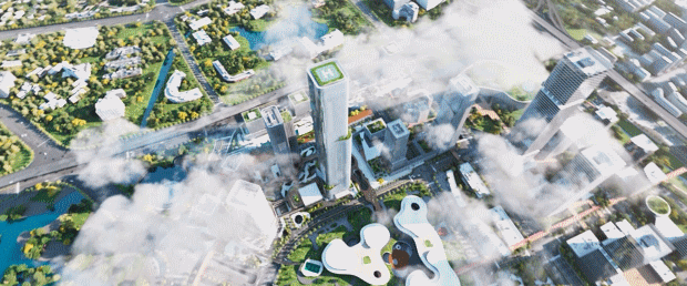 春宇地块由1栋330米办公及酒店塔楼、1栋200米住宅塔楼和商业裙房组成,总占地面积约为3.2万㎡,总建筑面积约35.4万㎡。